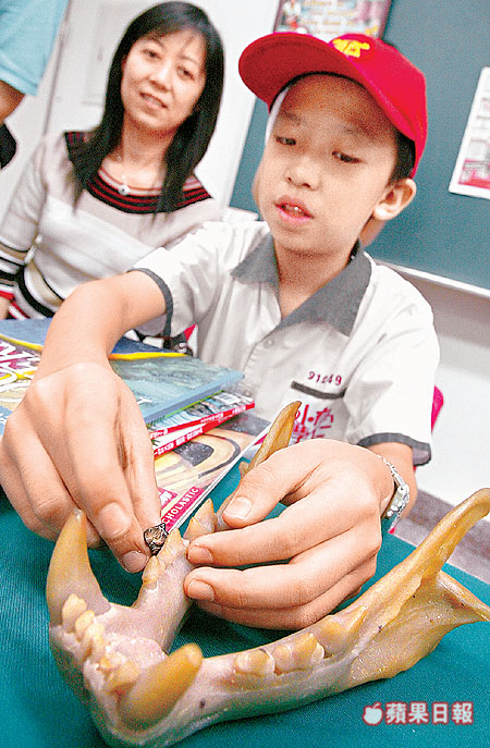 今年七月一日下午,菜寮溪畔一顆黑亮小石子,吸引許睿農眼光;他說,當時覺得這顆石子與其他圓石不同,隨手放進採集袋中,媽媽透過朋友送到科博館鑑定,不料這個小黑石竟是台灣虎臼齒化石,他昨將這顆化石贈與科博館。