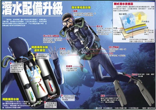 潛水活動日益風行,相關配備也不斷升級,包括潛水衣材質創新、以及水肺功能強化。現有閉路循環水肺可將潛水員呼出空氣回收利用,不但大幅延長潛水時間,也因氣泡減少更有利於觀察海洋生態。