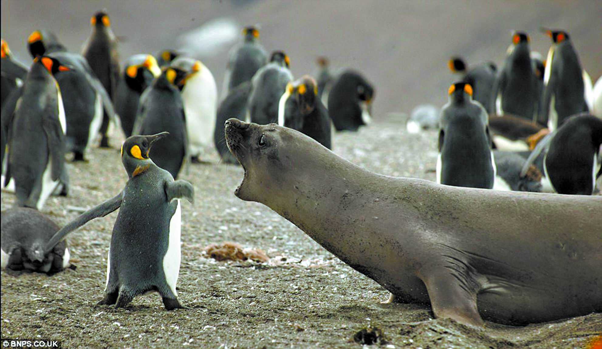 張博任表示,國王企鵝體重約在十公斤以下,但南象鼻海豹的體重就可能重達三、四千公斤,光體重就比國王企鵝重三百倍;但這隻白目的國王企鵝,揮舞雙翅的動作(左圖),也惹惱了南象鼻海豹,發出嘶吼聲,最後國王企鵝連忙倒退,逃之夭夭。