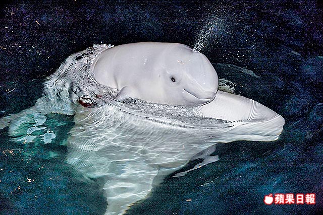 小白鯨順利出生後,在水池裡四處游動。
