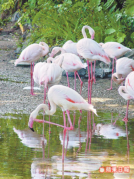台北市立動物園紅鶴區的大紅鶴因常用一腳站立(圖1),吸引不少遊客觀賞。園方表示,大紅鶴是一千萬年前就已存在的古老鳥類。鳥類如紅鶴和鷺鷥之所以金雞獨立,是為避免雙腳都站在水中,增加體溫流失速度,且左右腳會交替使用。紅鶴進食時先以鳥喙含水和泥巴,再用嘴中薄板片過濾可食的小蝦和水生動物(圖2)。