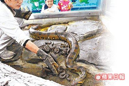 台南縣頑皮世界野生動物園,上月引進一條5公尺長的綠森蚺,三天前突然產下17條小蛇(圖)。動物園副主任李英俊說,別被牠粗胖溫馴的外表給騙,園方故意丟了一隻十幾公斤的小麝香豬給牠進補,小豬沒兩下就被活吞,至於那些剛出生的小綠森蚺,張口就吞下小老鼠,十分嚇人。