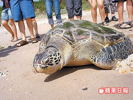 一隻綠蠵龜去年在屏東縣一遊樂園被發現受傷後,交由海生館照料,已恢復健康,昨天於後壁湖沙灘將牠野放。不過,由於海生館一年來餵食魚肉、包心菜和海藻等豐盛食物,這隻綠蠵龜體重直逼70公斤,同樣距離,平常十多秒就能爬入海中,竟花了5分鐘。